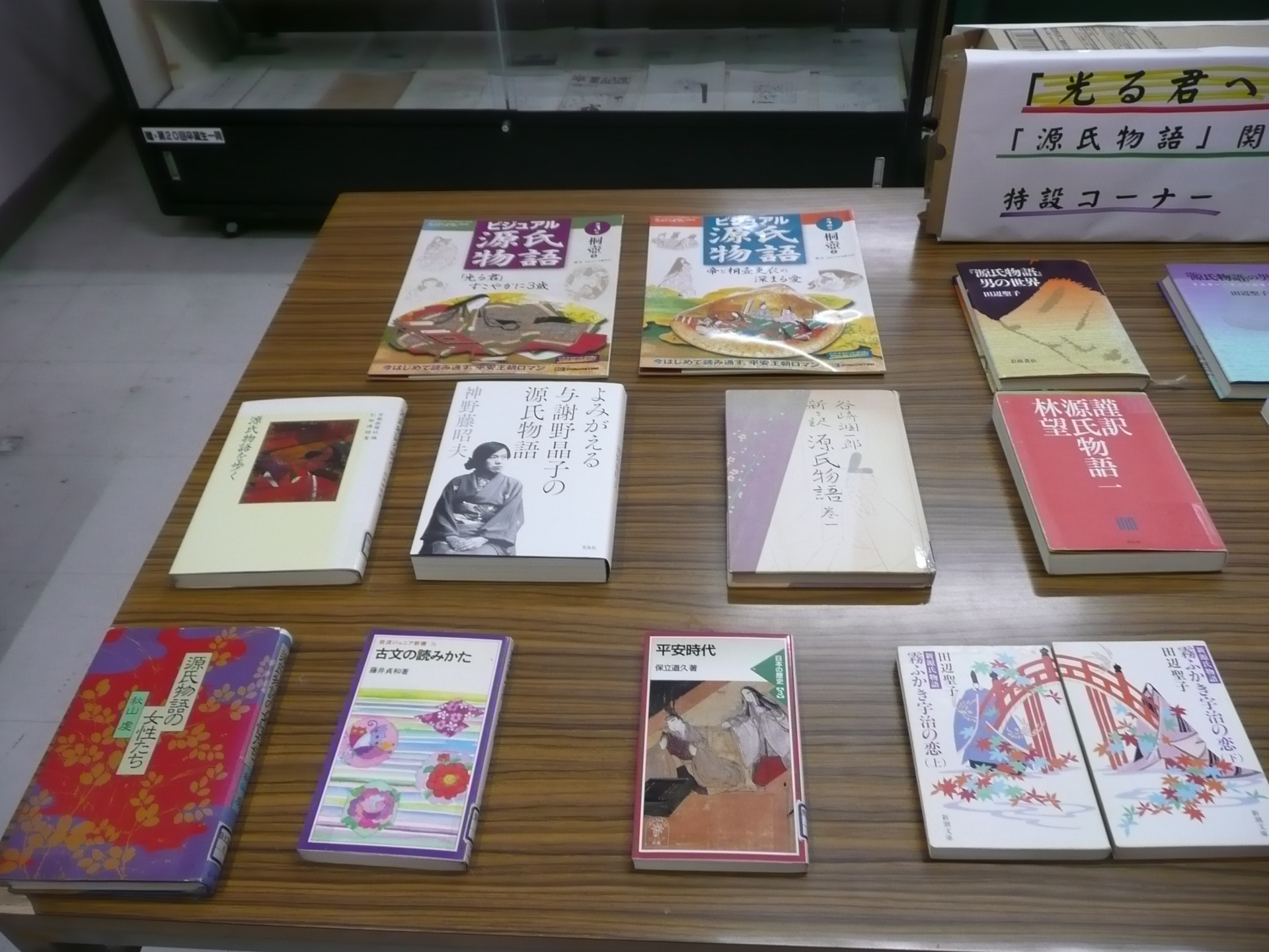 本校、図書部は所蔵の『源氏物語』に関する図書をまとめて展示しました。