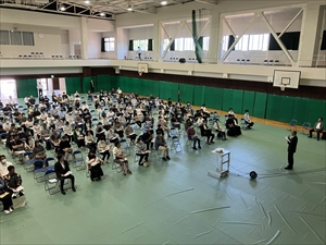 その後、体育館にて、近畿大学入学センターの屋木清孝先生による近畿大学説明会が行われました。屋木先生からは近畿大学の魅力や本校からの特別推薦制度のお話や、「夢から逆算して行動を起こす」高校生を育てるための親としての心構えなど、とても興味深いお話をしていただき、1時間という時間があっという間に過ぎてしまいました。