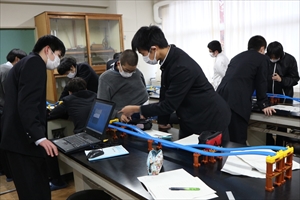 生徒たちはレール間のずれや測定のタイミングなど、細かい部分をグループで話しながら修正したり、データの整理を相互で確認しながら行ったりするなど、自分たちで実験の精度を上げていこうと創意工夫する姿勢が見られ、感心しました。