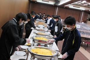 その後、手指消毒を行った上で手袋を着用し、ビュッフェ形式で食事をとっています。