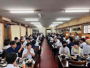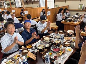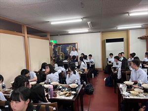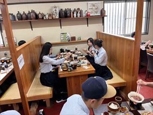 散策後は「信楽たぬき村」に向かい、昼食です。メニューはすき焼きで、生徒たちも喜んでいる様子でした。