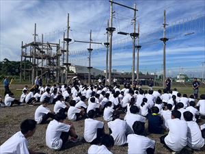 クイズや談笑を交えながらの講演で、アスレチックで疲れている生徒たちも説明に聞き入っていました。