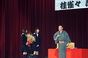 学校行事 2014.10.04 芸術鑑賞会 芸術鑑賞会 [発信日:平成26年10月4日] 10月4日(土)本校体育館において、桂雀々さん、桂かい枝さん、桂優々さんをお招きし、落語鑑賞会を行いました。午前の部は本校生徒を対象に午後は一般の方々を対象に行いました。生徒対象の落語教室や出囃子(鳴り物)の実践もあり、楽しいひとときを過ごしました。落語会に先がけて、吹奏楽部の演奏やダンス部によるダンスパフォーマンスが披露されました。 NEWS一覧に戻る カテゴリ一 校長メッセージ重要なお知らせお知らせ学校行事部活動事務室より海外研修入試関連情報