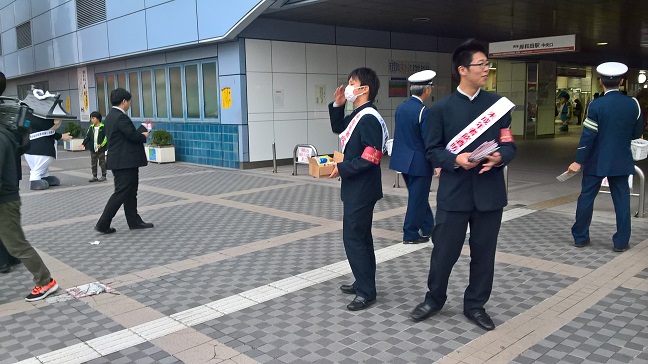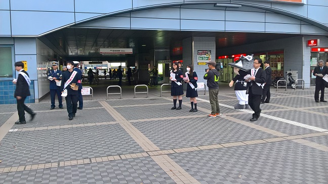 4月4日(月)夕方5時より南海岸和田駅付近で岸和田貝塚小売酒販組合の主催で、岸和田警察署、税務署と合同で行われた未成年者飲酒防止・痴漢防止・飲酒運転撲滅キャンペーンに本校の生徒会役員6名が参加しました。生徒たちは用意されたチラシや防犯ブザーを道行く方に配布し、未成年者飲酒防止・痴漢防止・飲酒運転撲滅の協力を呼びかけました。