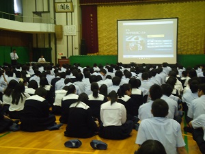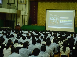 6月28日(火)、6限目を利用して、全校生徒を対象に「交通安全講習会」が開かれました。昨年の6月に改正道路交通法が施行され、自転車の違反者にも講習が義務付けられていることや、自転車によって引き起こされた事故の事例について、大阪府警岸和田警察署交通課の方の講演と、DVDによって学びました。身近な乗り物である自転車でも様々な危険性があることや、ルールを守ることの大切さなど、生徒達は真剣に話を聞いていました。