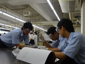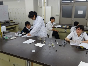 その後、実験室へと移動し「ルミノール反応」の実験を行い、講義で学んだ有機物の化学発光を実際に確認しました。各班2~3名ずつということもあり、十分に実験操作を体験することができました。生徒たちは、発光時間や光の強さを計測しレポート作成に取り組みました。