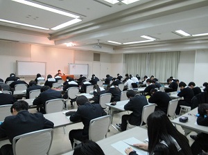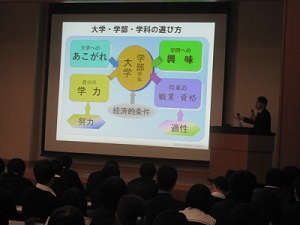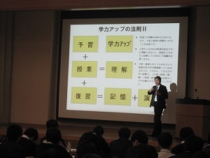 講演会は代々木ゼミナール入試本部長山根先生より、大学入試へ取り組むために興味、関心から意識を高め学習へ取り組む時間をより多くとること、記憶力を高めるには効果的な反復学習を行うこと、今高校2年生が行う学習は高校1,2年の学習内容の確認と復習であることなど受験生にとって非常に有益な内容を講演していただきました。