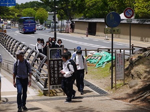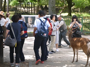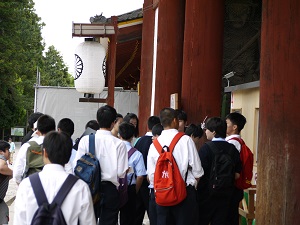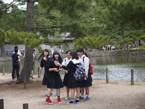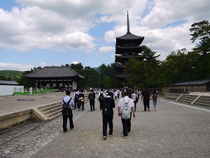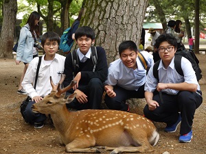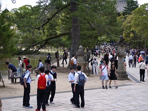 その後、生徒たちは班ごとに分かれて、鎌倉時代につくられた東大寺南大門を通って、そこに安置されている金剛力士像〔阿形・吽形〕を見、大仏殿に入って盧舎那仏像を拝しました。奈良公園や近鉄奈良駅周辺で昼食をとったり、お土産を購入して、興福寺に再集合し、予定より早く16時10分に帰校しました。