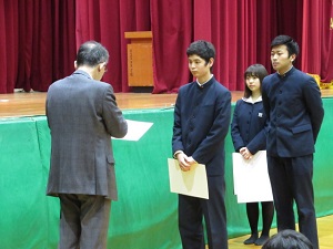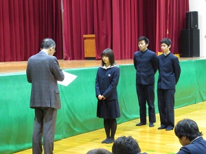 学校行事 2018.01.06 3学期始業式 3学期始業式 [発信日:平成30年01月06日] 1月6日(土)、3学期始業式が行われました。 牧本校長式辞 書道部表彰(高校芸文祭入選) 始業式のあと2~4限は通常授業を実施し、放課後は3年生はセンター試験対策、1・2年生は英検1次対策を実施します。 NEWS一覧に戻る カテゴリ一 校長メッセージ重要なお知らせお知らせ学校行事部活動事務室より海外研修入試関連情報