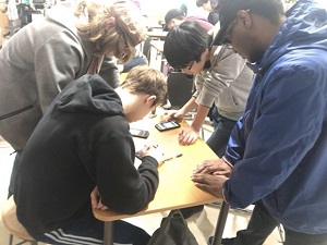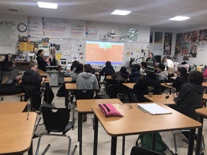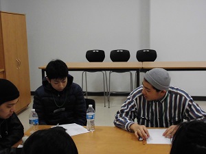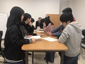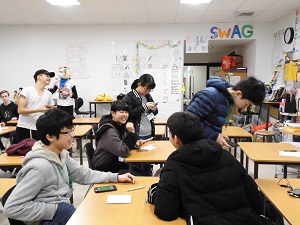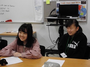 日本語クラスではルーズベルト高校の生徒は日本語で、近大泉州高校の生徒は英語で、携帯を使ったゲームや自己紹介をし、お互いに母国語を教え合っていました。