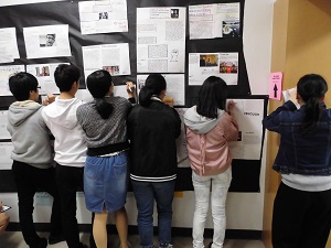 また、掲示板に掲示されている英文を書き写し、読み上げ、ライティングと発音の勉強も行いました。