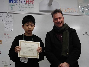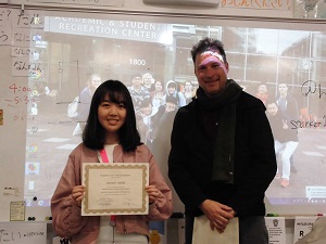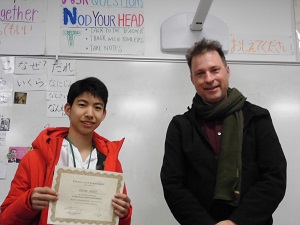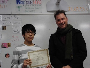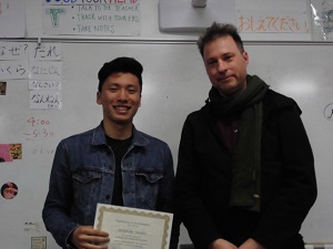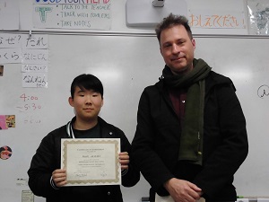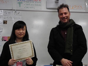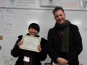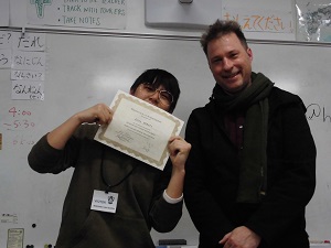 ビザやお寿司などを頂きながら楽しく歓談した後、生徒はパトリック先生から修了証を受け取りました。