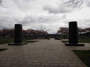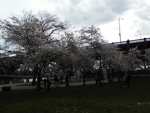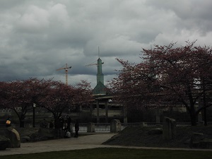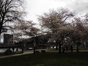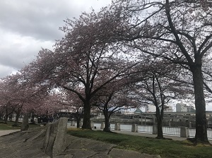 本日はオールドチャイナからウィラメット川沿いを歩きました。そこには 日系アメリカ人史跡記念広場公園( ここは、第二次世界大戦中にアメリカの捕虜収容所に収容された日系人を追悼する公園)というところがあり桜がきれいな場所です。あいにくまだ満開ではありませんでした。学校の桜並木はどうでしょうか?