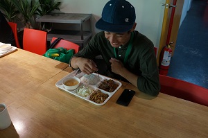 テスト終了後、昼食を食べました。メニューはタコライス、ナスの天ぷら、トマトスープでした。