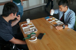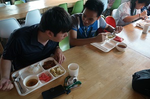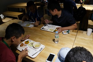 午後のレッスン後は夕食を食べました。夕食のメニューはライス、卵スープ、サラダ、かぼちゃの煮物、チキンの甘辛煮でした。