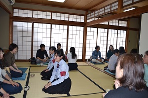 茶道部の接待。お茶とお菓子をいただきながら、在校生の話を聞くことができました。