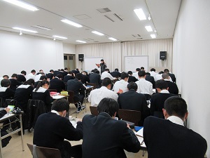 会場に到着すると、まずは開校式と、代々木ゼミナールの青柳先生による講演が行われました。講演は「大学受験と受験生としての心構え」というタイトルで、受験を乗り越えて希望進路を実現させるためには、具体的に何を考えてどう行動するべきなのかを、分かりやすく説明していただきました。生徒たちは時おりメモを取りながら熱心に聞き、意識を新たにしていました。