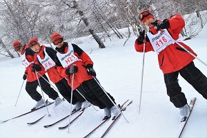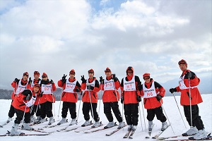 スキー講習2日目。昨夜の降雪により、ゲレンデコンディションもよく、青空のもと元気よく実習を行いました。