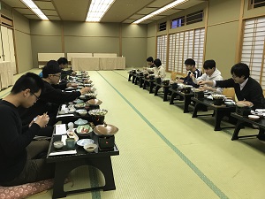 学年末考査後、13時15分発のスクールバスで和歌山に向かいました。車庫でバスを乗り換え、17時前に「ホテル&リゾーツ和歌山串本」に到着しました。途中、バスが横に揺さぶられるほどの強い寒風が吹きすさぶ日でしたが、夕食はこごみや菜の花、筍、鰆など春の到来を感じさせる食材が彩られ、他の海の幸も十分堪能させていただきました。参加者一人一人が自己紹介を行い、その晩は各自思い思いに過ごして翌日の研修に備えました。