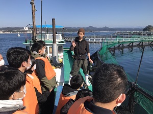 その後、港で救命胴衣を着用して船に乗り、最初にクロマグロの成魚の網いけすを見学しました。3年で30kgまで成長し、40~50kgで出荷されるとのことです。昨年7月の台風では、時間をかけて育て上げた魚たちも被害を受けたとのことで、自然の猛威が養殖にとって一番の弱点であると痛感しました。