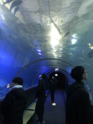 続いて美しい海岸の風景を眺めながらバスで西に15分ほど走り、串本海中公園に入場しました。串本の海を再現した大水槽では、生きたサンゴが揺れ、色彩豊かな魚たちが泳ぎ回り、皆食い入るように観察していました。ウミガメパークでは、重さ100kg超もいるアオウミガメが泳ぎ、ここではエサやりを楽しみました。水中トンネルでは、サメやエイ、クロマグロなどが回遊していました。