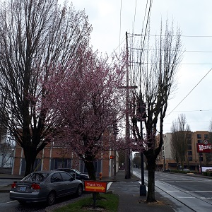 昨日から小雨が続いており、日本より少し肌寒いですが、ポートランドではすでに桜が咲いています。