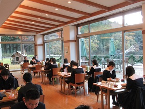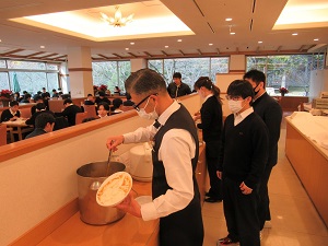 おかわりもいつもはセルフサービスでしたが、今年は従業員の方が一人ずつ給仕する形となっています。また、生徒も席を立つときは必ずマスクを着用しています。食事を終えた生徒は再びマスクを着用し、ようやく会話が出来るようになります。少し大変ではありますが、新しい生活様式として、生徒たちもしっかり意識して行動していました。