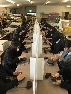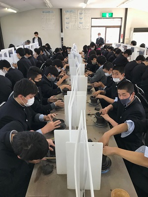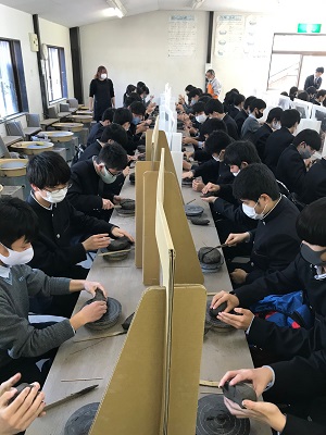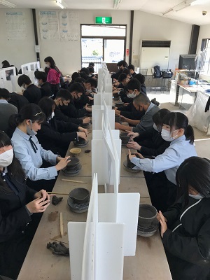 生徒たちは約1時間かけて、茶わんやカップ、お皿などをじっくりと作りあげました。
