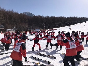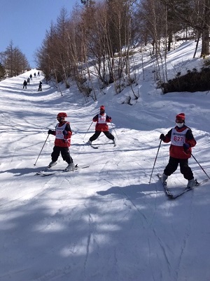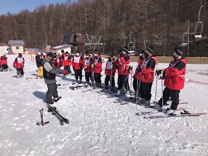 開講式ののち、各班に分かれて講習が始まりました。朝から快晴に恵まれ、スキーウェアを着用すると汗をかくほどです。初心者班は、スキー場の下の方で基本から教わります。中級者以上はリフトに乗り、上のコースで滑り始めました。