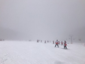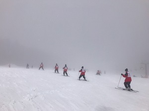 夜中に雪が降り積もり、良い雪質に恵まれましたが、山々が白いガスに覆われ、視界不良の中での実習最終日となりました。