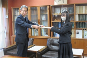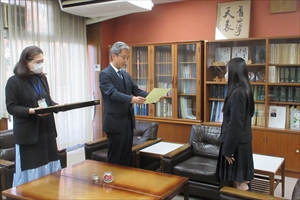 今年度は2年A組の南音綾さんが『「平等」を作る』と題した作文で岸和田税務署長賞を受賞し、12月8日(金)に税務署の職員の方が来校されて表彰式が行われました。
