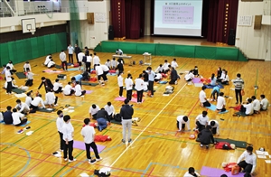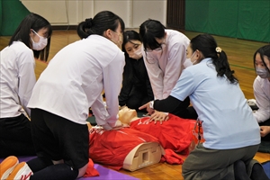 まずは保健の授業で心肺蘇生法の基礎を事前学習し、その後講習会で体得します。インストラクターの先生が、現場さながらのシチュエーションを設定し、傷病者発見から心肺蘇生に至るまで、実に具体的に学ぶことができました。