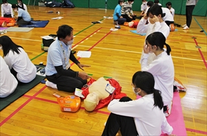 高校生でも救える“いのち”があるということを知ってもらい、また、希薄化する社会において、倒れた人を発見した時や困った人がいた時に、手を差し伸べられるような大人になってほしい、そう願い、本校では継続してAED講習会を行っています。