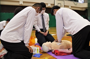 大阪ライフサポート協会のインストラクターの先生方及び岸和田消防の方々の熱心なご指導の下、約2時間、心肺蘇生法の中で最も重要な胸骨圧迫とAEDの使い方について実習しました。一部の教職員も生徒と共に参加し、学びました。