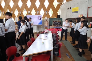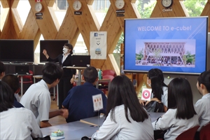 8月23日、1学年と2年C組の希望者38名で、近畿大学英語村(e-cube)の体験に行ってきました。 プログラム前には持参した単語帳で意味を確認する姿が見られ、英語学習への意欲を感じることが出来ました。