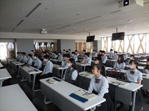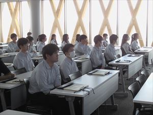 近畿大学の説明、理工学部の内容を詳しく聞き、本日行う実験の内容を説明され、生徒たちは緊張しながらも話に聞き入っていました。