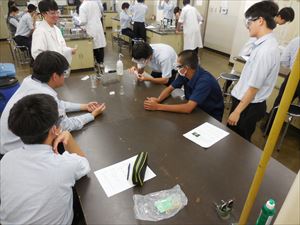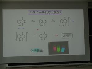 各班、近大生に補助して頂き、何とか化学反応が起こりました。ルミノール反応が起こった瞬間に、声を上げている生徒もいました。