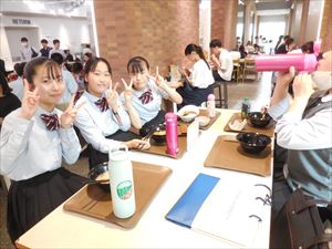 実験後は食堂で、昼食です。あまり時間がなかったですが、おいしそうに色々なメニューを注文し、食べていました。