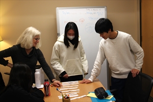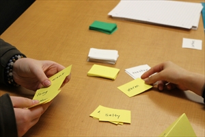 本日も午前中はアメリカ人の先生によるグループレッスンで、昨日一日の出来事を英会話で振り返ったり、自分の背中に貼られた人名を“Am I ・・・?“と質問しながら当てるゲームや、壁に貼られた会話をペアの1人が覚えて1人が書き取り、あとで順番に並べるなどのアクティビティを行いました。