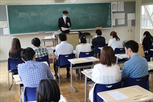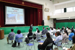 その後、体育館にて、近畿大学入学センターの屋木清孝先生による近畿大学説明会が行われました。