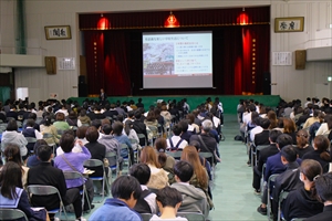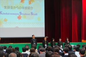 全体会は、生徒会による司会で、教員からの学校説明、卒業生スピーチ、生徒会による学校紹介、創作ダンス部の発表といったプログラムが続きます。