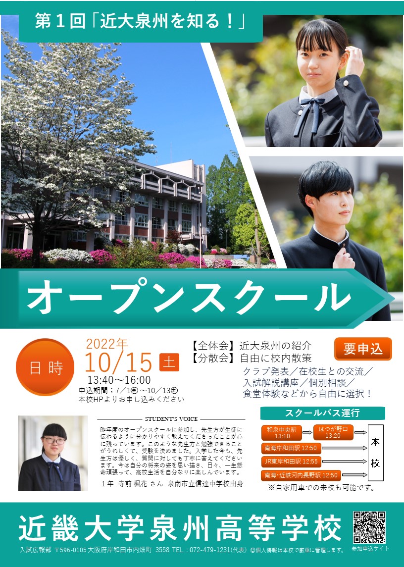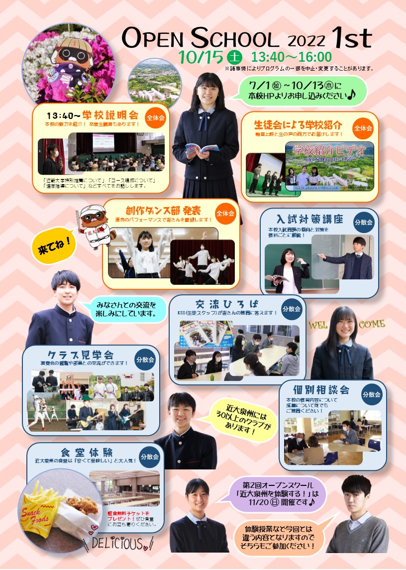 入試関連情報 2022.07.07 第1回オープンスクール(10/15土)受付中! 第1回オープンスクールの予約受付を現在行っています。 今年度の第1回オープンスクールは、クラブ発表見学や在校生との交流、食堂体験など楽しい企画が盛りだくさん! 岸和田、東岸和田、和泉中央、河内長野からスクールバスを運行しますので、気軽な気持ちでご来校ください。 日時;10/15(土)13:40~16:00 予約はこちらのページから オープンスクール詳細ページはこちら NEWS一覧に戻る カテゴリ一 校長メッセージ重要なお知らせお知らせ学校行事部活動事務室より海外研修入試関連情報