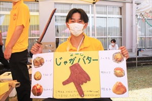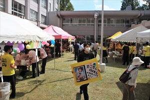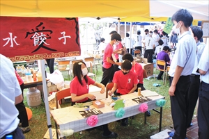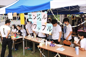 2・3年生は模擬店です。未経験者ばかりでうまくいくか心配でしたが、どの店も運営方法や味付け、装飾などに工夫が見られ、繁盛していました。このような経験を通じて、生徒たちは企画運営能力や問題解決能力を身に着けていきます。メニューは、ベビーカステラ、パスタ、ピザ、たこせん、ワッフル、大学芋、アメリカンドッグ、フランクフルト、ミルクせんべい、じゃがバター、水餃子などで、価格も50円〜200円とお手頃です。生徒会執行部は、バザーの出店もおこなってくれました。また、今年度は越智校長、平松教頭、学年部長を中心とする教員有志も、何人かのPTA役員さんのヘルプを受けながら、焼きそばの店を出店しました。