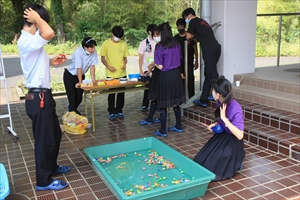 クラブ発表も盛りだくさんです。創作ダンス部・軽音楽部などの発表が、大盛り上がりの中、体育館の舞台で行われました。その他、野球部のバッティング体験やスピードガンコンテスト、男子バレー部のスーパーボールすくいは、さすが強化クラブという手際のよい運営でしたし、茶道部の抹茶・和菓子体験、ドローン部の飛行体験、自然科学部の活動紹介、書道・美術・写真部などの作品展示では、日頃の練習の成果がいかんなく発揮されていました。また、今年度は、近畿大学文芸学部芸術学科造形芸術専攻の学生作家の作品展示と販売会を、本校OB・OG(他大学の学生を含む)が実行委員となって運営するということも行われました。