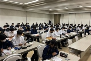 本日は英語、国語、数学の授業に加えて、午後から代々木ゼミナールの姜先生による共通テスト対策英語講座が開講されました。この講座は一般受験に挑戦する生徒だけでなく、近畿大学特別推薦や指定校推薦の被推薦者の生徒も参加するため、今回の合宿参加者計137名が受講しました。