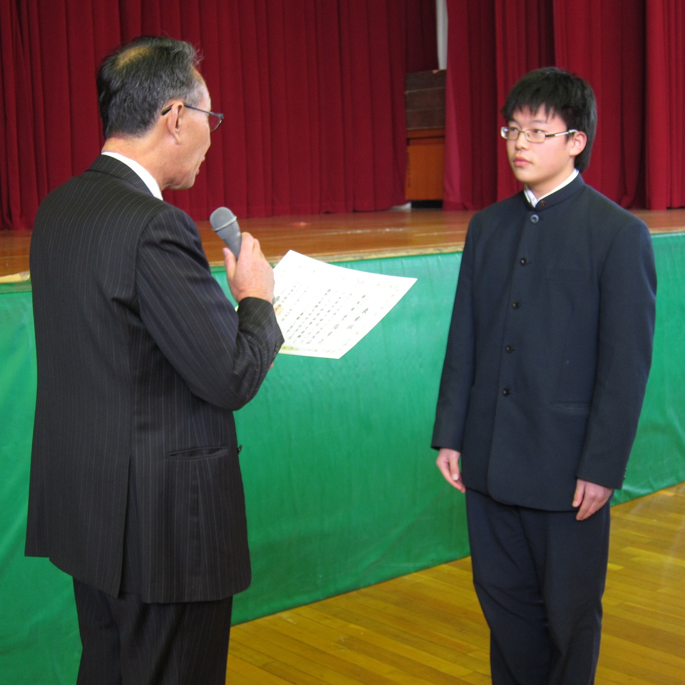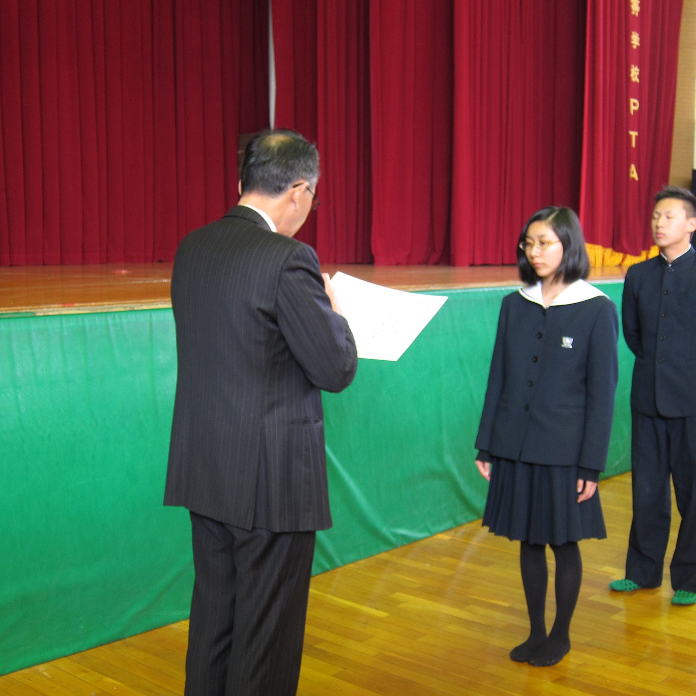 表彰では「税に関する高校生の作文」の優秀作品として、2C田端航大君と2D南絵理奈さんが表彰されました。第2回漢字能力検定成績優秀者として、1年青島淳気君、上平統也君、2年稲葉楓乃さんが、努力賞として、1A井上真美さん、小松巧平君、大洲勇貴君、島津将太君、寺本雅也君が表彰されました。